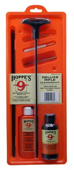 Designed with the needs of hunters and shooters in mind, Hoppe's No.9 Cleaning Kit with Steel Rod comes in a box that contains common products and tools needed to clean and maintain .17, .17 HMR, and .204 cal varmint rifles. This complete kit comes in clamshell packaging.