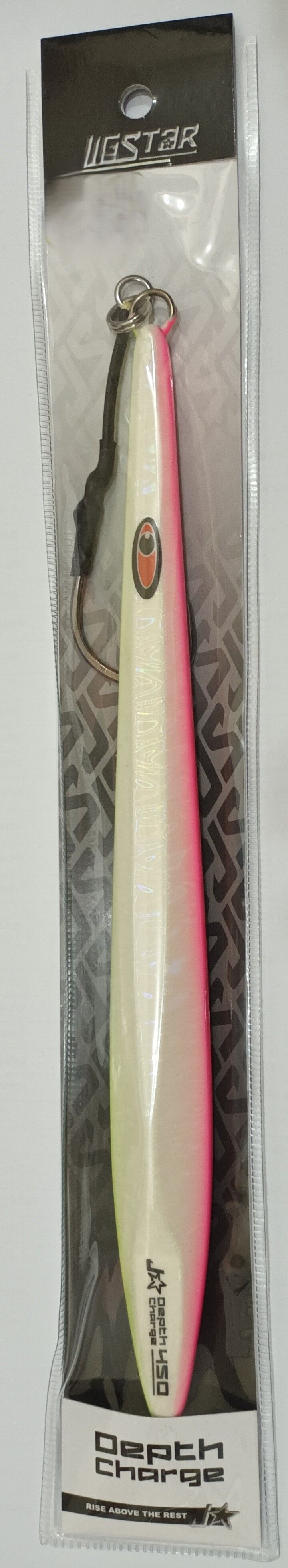 are long, tail weighted jigs with narrow streamlined neck graduating into a bigger heavy section near its tail. Due to its shape, the depth charge has little action but descends very quickly allowing you to hit small deep water targets successfully. Retrieve it quickly to produce much action. The Depth Charge works best with a fast, short jerk action to entice the bite and suits deep water.