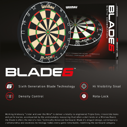 The latest in the Blade Series of dartboards offers stunning design, innovation and craftsmanship, featuring Winmau’s latest, Sixth Generation, dartboard technology.