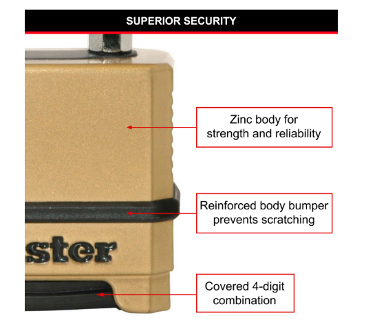 The roller pin cylinder provides maximum pick and pry resistance. The hinged dial cover and shackle seal offers superior weather protection, and reinforced body bumper protects against scratches.