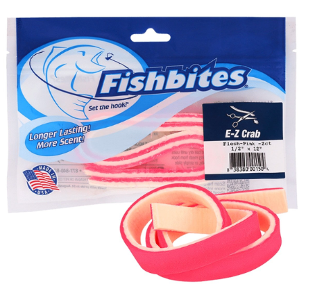 SALTWATER FISHBITES CATCH MORE FISH!What's the difference between the "Fast Acting" and "Longer Lasting" formulas?Most of our artificial baits come in both "Fast Acting" (red/orange packaging) and "Longer Lasting" (blue packaging) formulas. Maximum scent for minimum bucks is the motto for our Fast Acting baits. The rate of release and the percentage of stimulants have both been kicked up a notch in order to make the Fast Acting baits live up to their name. If target fish are plentiful and bait stealers are few, then the Fast Acting baits are a good bet. The gel used in these baits also make them ideal for late fall, winter, or early spring fishing or in places where water temperatures stay below 65 degrees. Our Longer Lasting formula provides extra durability for extended periods of time and makes a good choice for offshore bottom fishing, surf fishing, or when you're in the presence of numerous pesky bait stealers.Product DescriptionEndorsed by Bama Beach BumAvailable in 1/2″ wide, about 12″ long ribbonsJust cut it, hook it and cast it. All you need is sharp scissors. How EZ is that? E-Z Crab can be used on a bare hook or as a trailer on a jig or skirt. Each bait strip is 1/2″ wide and about 12″ long. Use them to catch a wide variety of saltwater species. The Longer Lasting formula features a cloth binder in the middle of the bait that keeps it on the hook despite the efforts of notoriously toothy bait stealers. While the gel is designed to work in all water temperatures, it’s best to use in water temperatures above 65F.Fishbites Longer Lasting EZ Crab Flesh-Pink Specs: