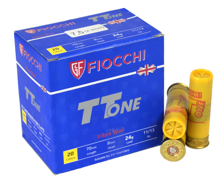 Specifications:• Manufacturer: Fiocchi • Model: TT One• Shot type: Lead• Calibre: 20ga• Shot size: #7.5• Shot weight: 24gr• Velocity: 375 m/s• Shell length: 70mm / 2 3/4"• Packet quantity: 25 Rounds• Case quantity: 250 Rounds• Wad: Fibre Wad