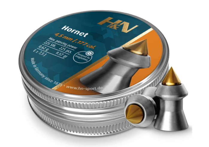 Specifications:• Calibre: .177 cal• Weight: 9.57 grains• Head Shape: Pointed tip • Pellet Shape: Diablo• Material: Brass tip & Lead base• Shooting type: Hunting• Minimum Muzzle Energy: 7.5 J• Maximum Distance: 30 m• BC: 0.016• Tin Quantity: 225 rounds