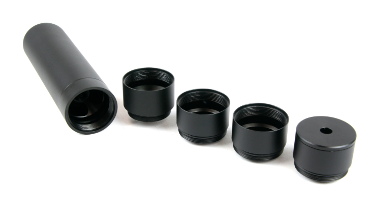 The modular design allows you to customise the performance to your specific requirements by increasing or decreasing the number of baffles. One or both of the two middle threaded baffles can be removed to create a lighter silencer, or simply screw in additional threaded baffles to create a quieter silencer.