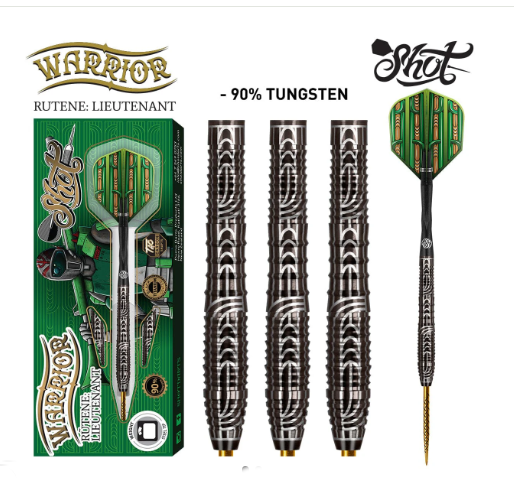 General InformationDARTS: Set of 3FLIGHTS: Warrior Rutene Small Standard FlightsSHAFT: Tao Black Carbon Inbetween Shafts with RingsPOINTS: Warrior 35mm Engraved Steel PointRANGE: Warrior RangeSpecificationsMATERIAL: 90% TungstenTHREAD: 2BAMATCH WEIGHTED: +/- 0.05 gmFEATURED GRIP: Wide Shark GripGRIP LEVEL: 3/5APPEARANCESHAPE: TorpedoBALANCE:Front WeightedCOATING: Cinder Grip