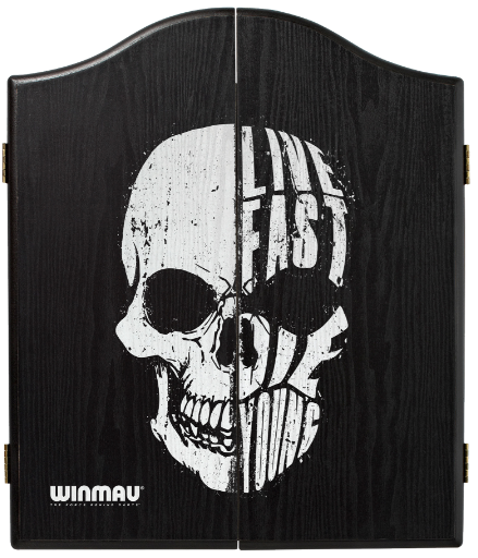 Black with White Skull dartboard cabinet. Suitable for all Winmau bristle dartboards. Feature Home and Away easy wipe scoring panels.