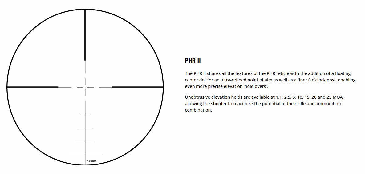 The advanced PHR II reticle combines a floating centre dot and unobtrusive elevation holds, offering the precision needed for long-distance shooting. Its clean design provides quick visual reference for holdovers, while the 4-16x magnification range ensures you stay on target from mid to extended range.