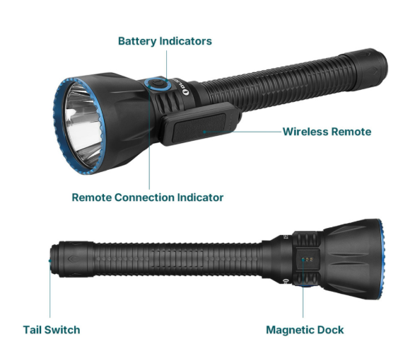 Paired with the flashlight, the wireless remote enables you to control the flashlight from up to 8 meters away; ensuring quick access when it is positioned beyond immediate reach. Magnetic dock on the side charges the remote and holds it steady, keeping it readily available and perfectly positioned for immediate use whenever needed.
