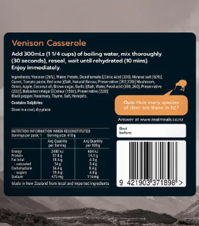 Venison (26%), Water, Potato, Diced tomato [(Citric Acid (330), Mineral salt (509)], Carrot, Tomato paste, Red wine [(Salt, Natural flavour, Preservative (202, 220)], Mushroom, Onion, Apple, Coconut oil, Brown sugar, Garlic [(Salt, Water, Food acid (330, 260), Preservative (202)], Balsamic vinegar [(Colour (150c), Preservative (220)], Black pepper, Rosemary, Thyme, Salt, Horopito.